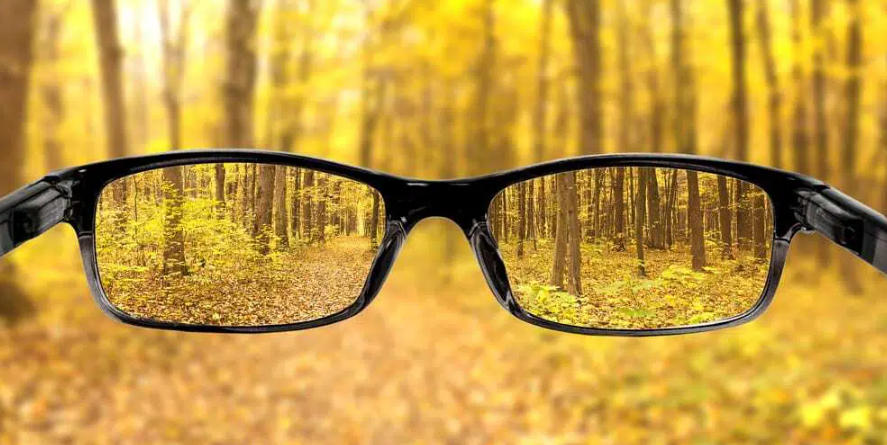 This picture shows us that with our glasses off, we can't see shapes well: the trees are blurry. But with our glasses on, we can see distinct shapes: the trees are distinct.