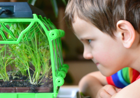 For example, this kid is intent on studying the plants inside the terrarium. He's looking intently at the plants.