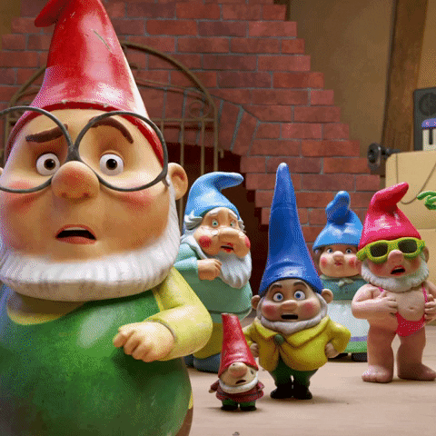 Below, the scared gnomes scatter in all directions. They run off every which way.
