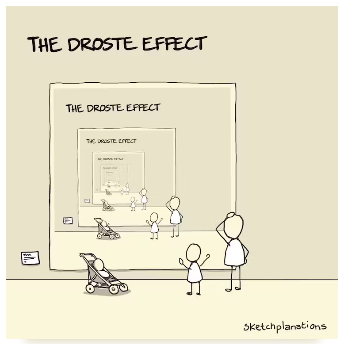 Explain the meaning of "Droste effect" without saying "picture in picture in picture" or "mise en abyme."