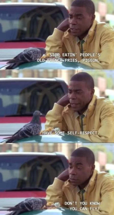 Here's Tracy Morgan's character on 30 Rock, trying to convince a pigeon to stop abasing itself.