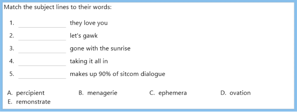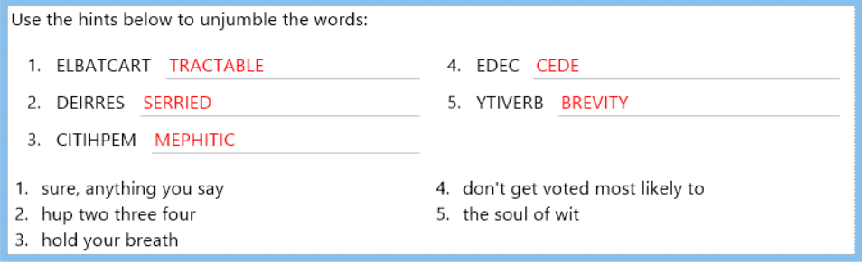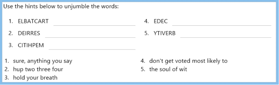 In each issue this month, I'll share a puzzle or other activity that prompts you to recall 5 previous words based on their subject lines. (To make your own activities like these, check out the fun and useful Vocabulary Worksheet Factory.) And I'll share the answers in the following issue.