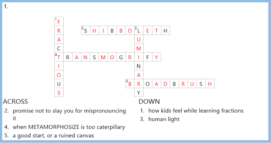 In each issue this month, I'll share a puzzle or other activity that prompts you to recall 5 previous words based on their subject lines. (To make your own activities like these, check out the fun and useful Vocabulary Worksheet Factory.) And I'll share the answers in the following issue.