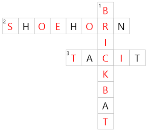 If you like, you can review the words shoehorn, tacit, and brickbat. Extra clues: