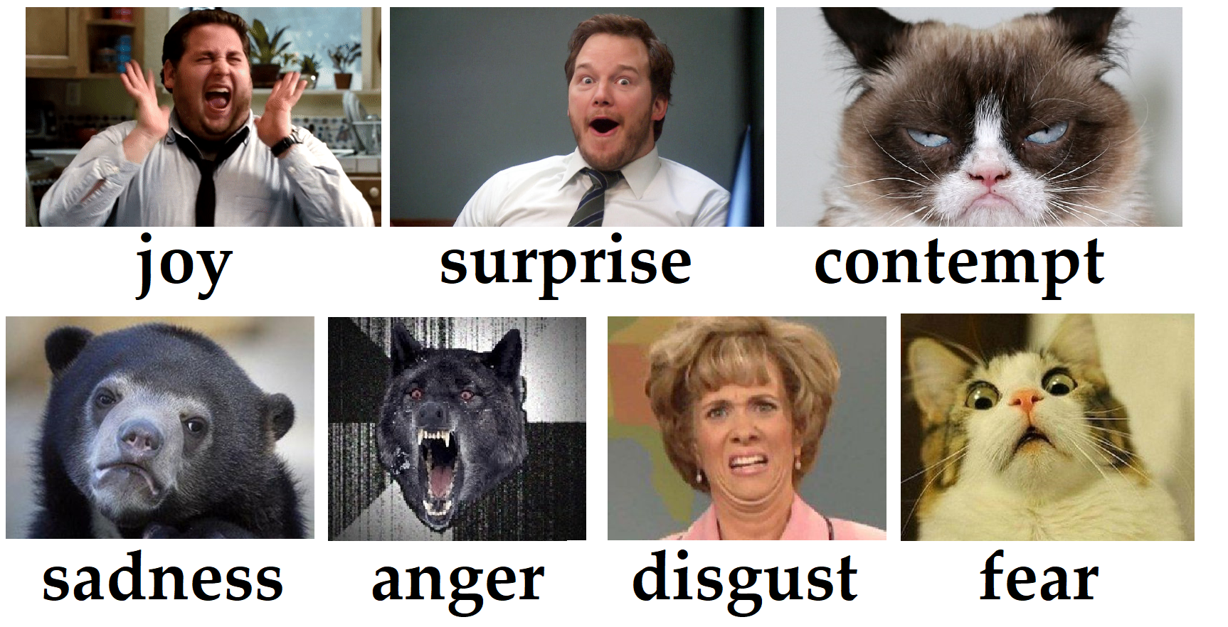If the word you're studying were a facial expression, what would it look like? Maybe one of the seven universal facial expressions, the ones identified by the psychologist Paul Ekman. I've used some memes to illustrate them: