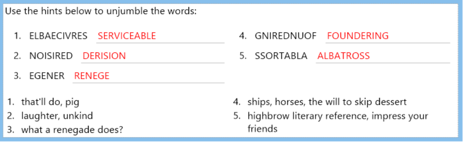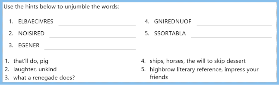In each issue this month, I'll share a puzzle or other activity that prompts you to recall 5 previous words based on their subject lines. (To make your own activities like these, check out the fun and useful Vocabulary Worksheet Factory.) And I'll share the answers in the following issue.