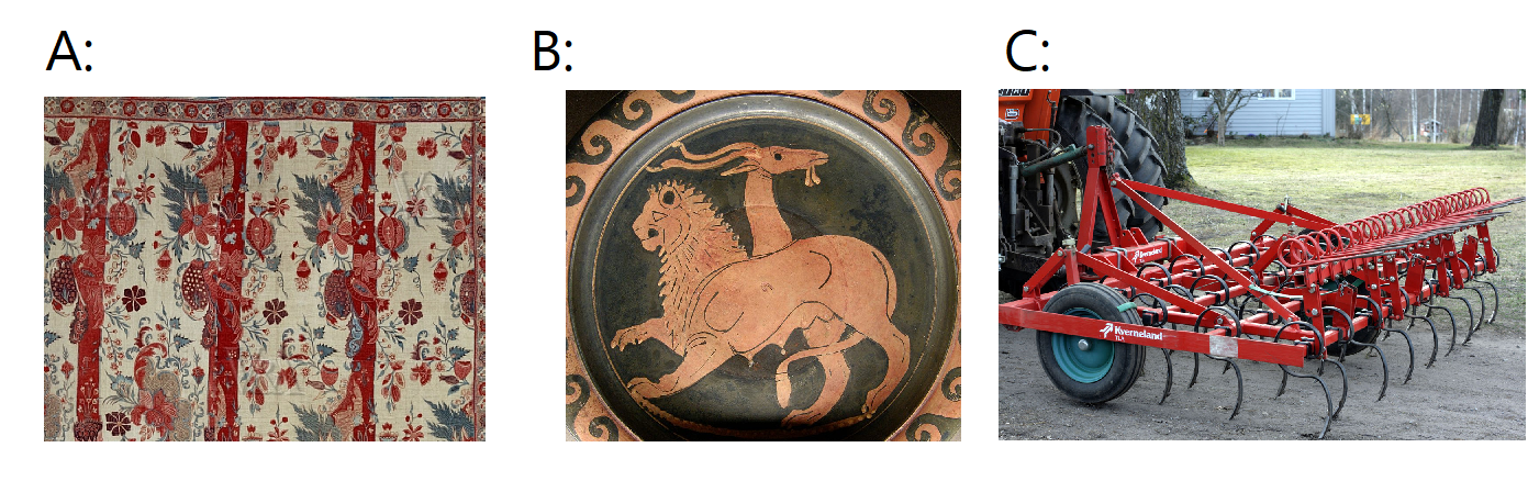 A: chintz, B: chimera, C: harrow.