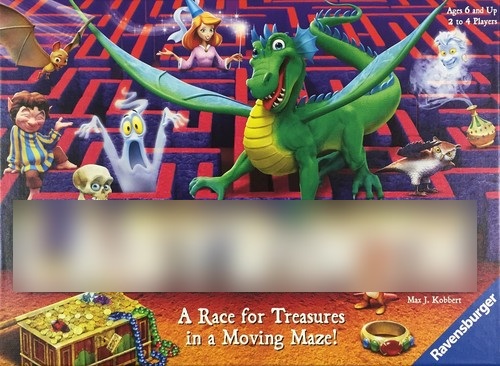 Designed by Max J. Kobbert, this game sends players on a treasure hunt in a maze-like structure with shifting rows of tiles. The title means "something complicated, confusing, and tough to navigate that reminds you of a complex set of paths or passages." It's pictured below, with the title blurred out. What game is this?