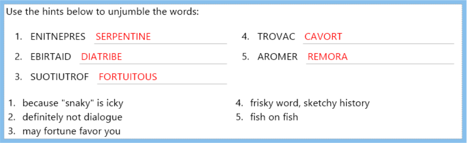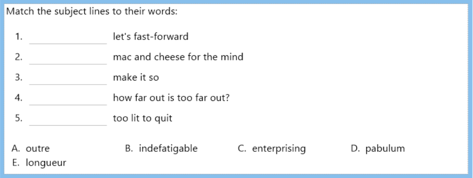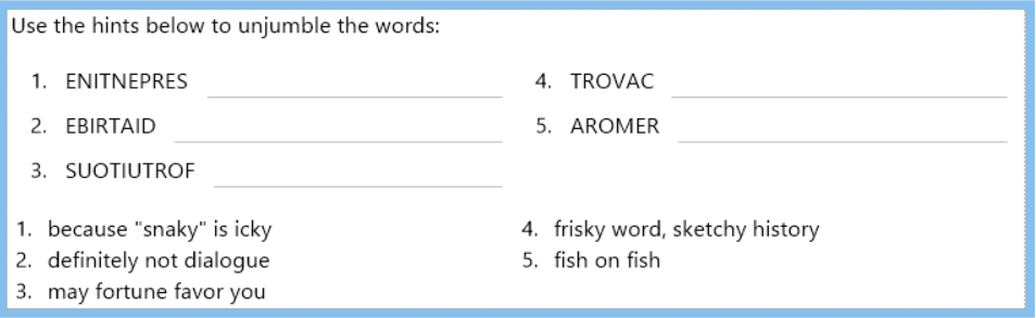 In each issue this month, I'll share a puzzle or other activity that prompts you to recall 5 previous words based on their subject lines. (To make your own activities like these, check out the fun and useful Vocabulary Worksheet Factory.) And I'll share the answers in the following issue.