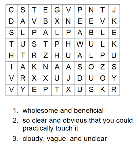 Disclaimer: Word meanings presented here are expressed in plain language and are limited to common, useful applications only. Readers interested in authoritative and multiple definitions of words are encouraged to check a dictionary. Likewise, word meanings, usage, and pronunciations are limited to American English; these elements may vary across world Englishes.